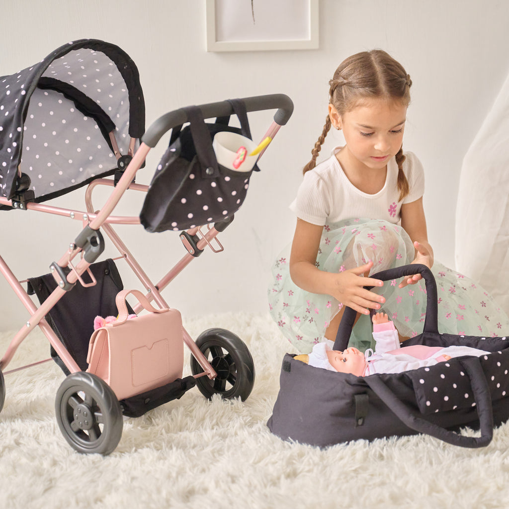 NURTURING: Classic stroller with removable bassinet, adjustable canopy, basket, and bag for caring play.