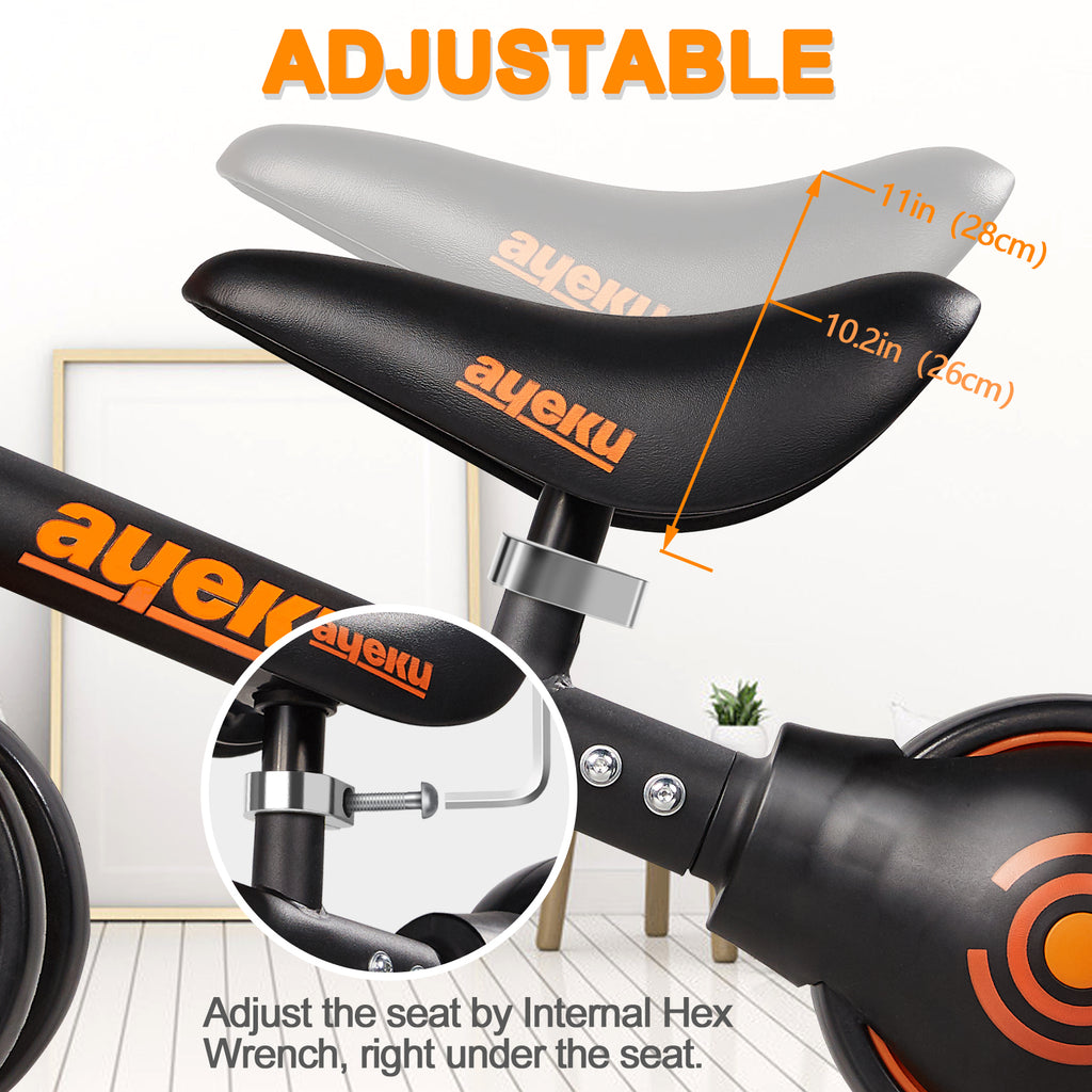 The seat is adjustable from 26 to 28 cm, allowing the bike to grow with your child as they progress through key early milestones. The three EVA foam wheels glide silently across indoor surfaces without marking or scratching, and provide a smooth, stable ride outdoors on flat terrain. Parents never need to worry about noise or damage to floors, making this bike perfect for year-round use inside the home.
