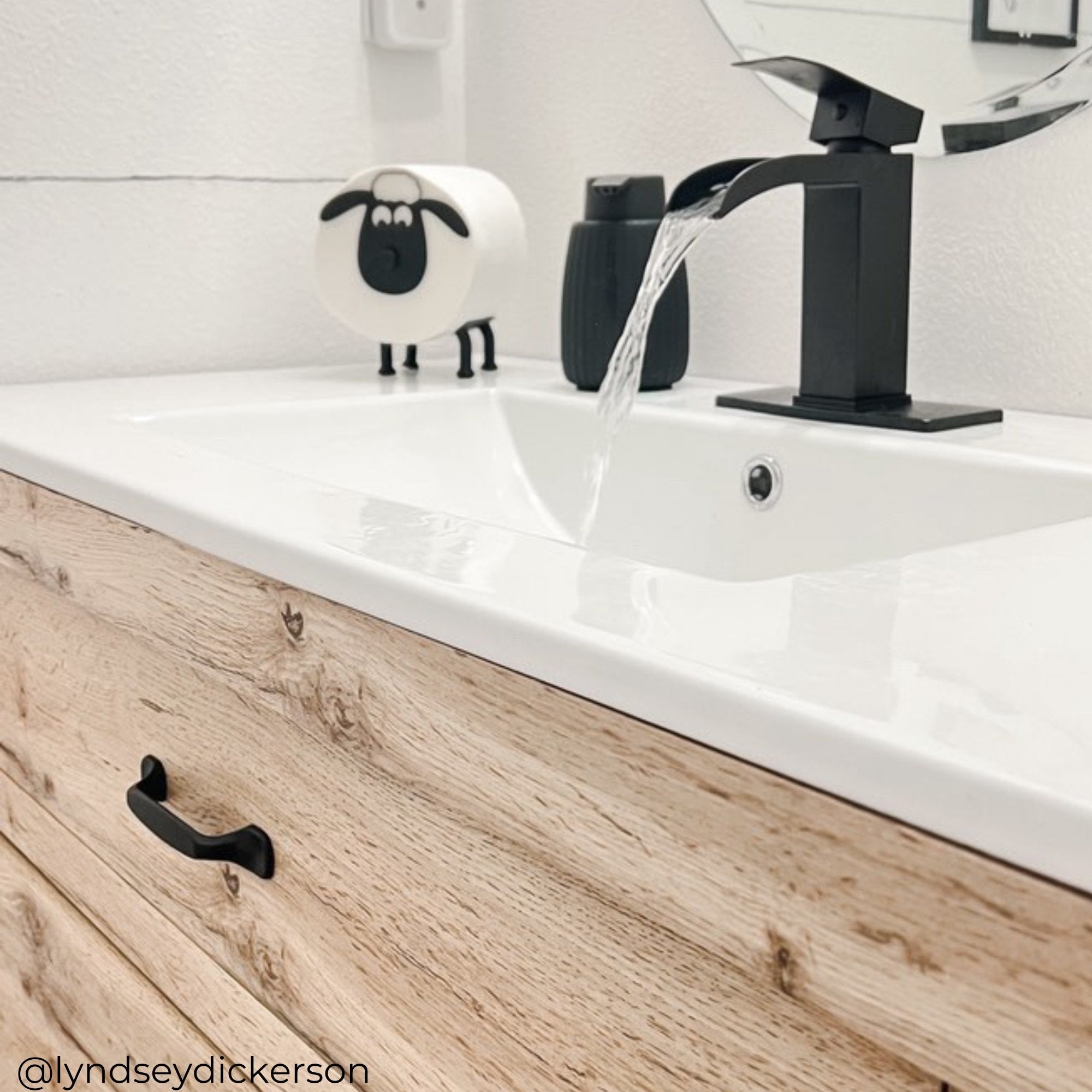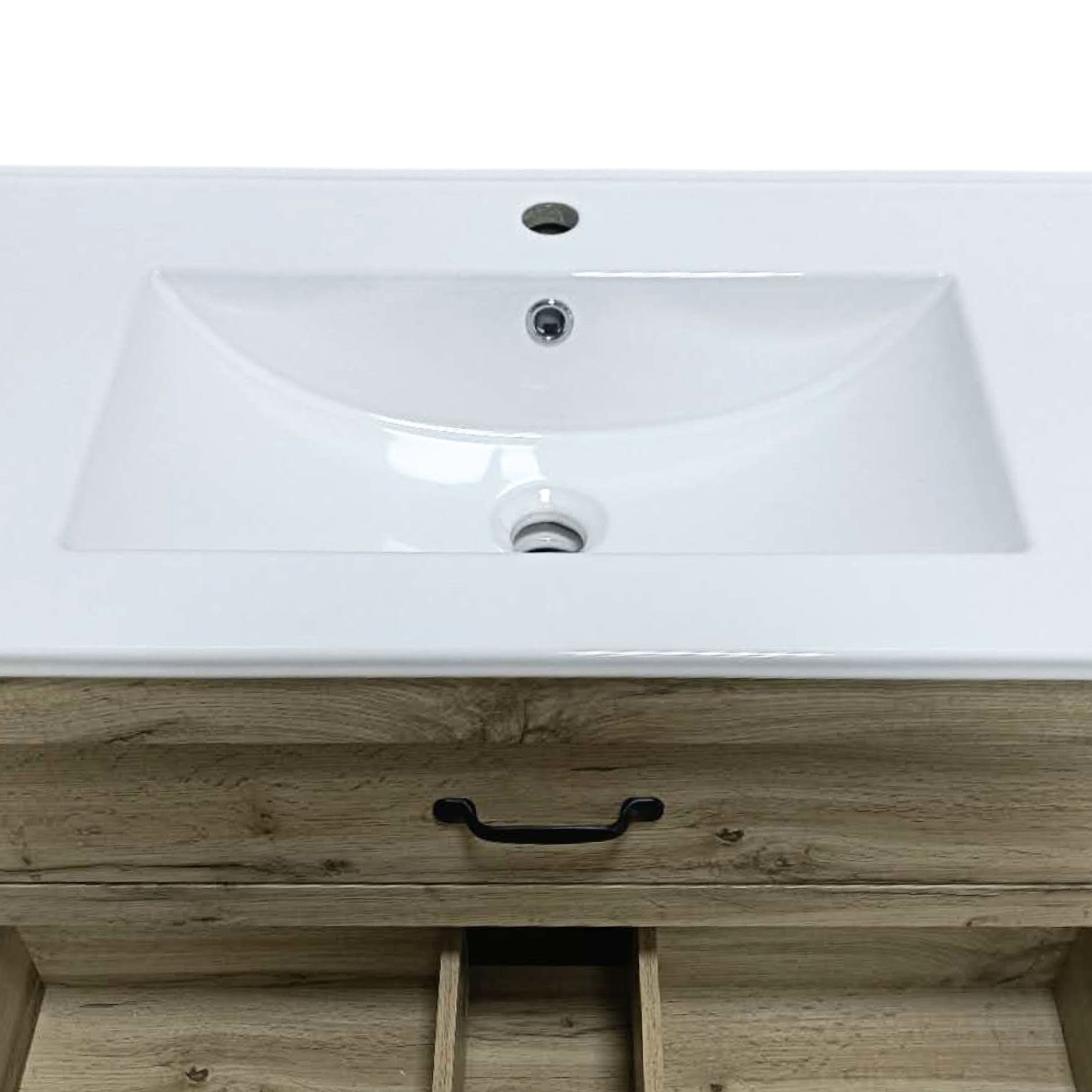 SLEEK, SINGLE SINK VANITY: Cabinet features a light oak paper laminate finish and rustic matte black drawer handles