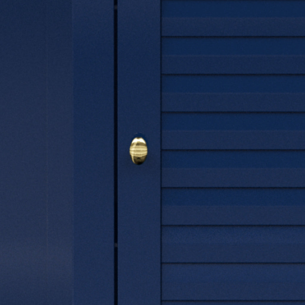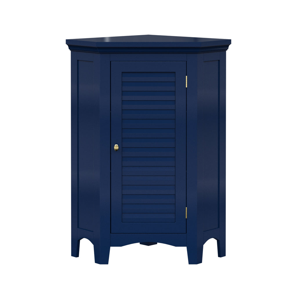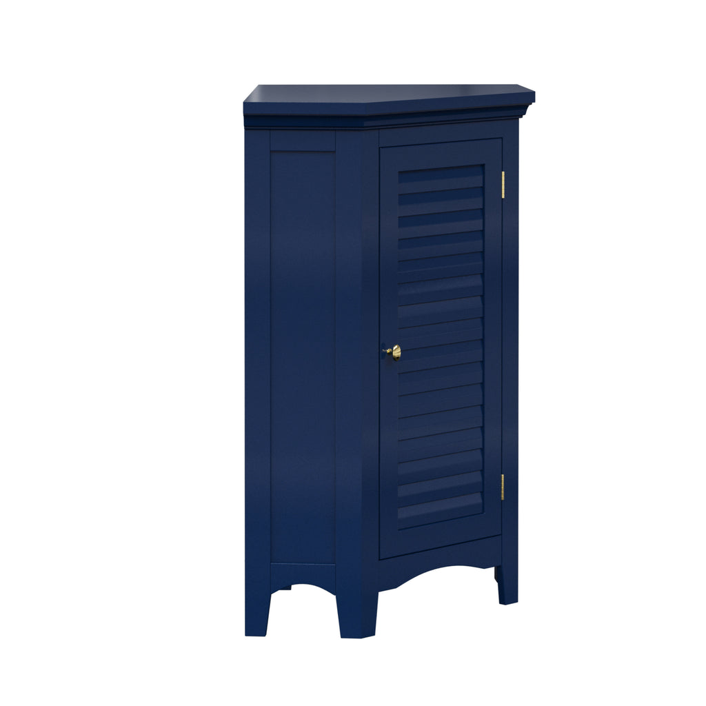 STYLISH FARMHOUSE STORAGE CABINET: Features a crown molded top and skirting, faux louvered door and shaker-style legs for a visual dimension