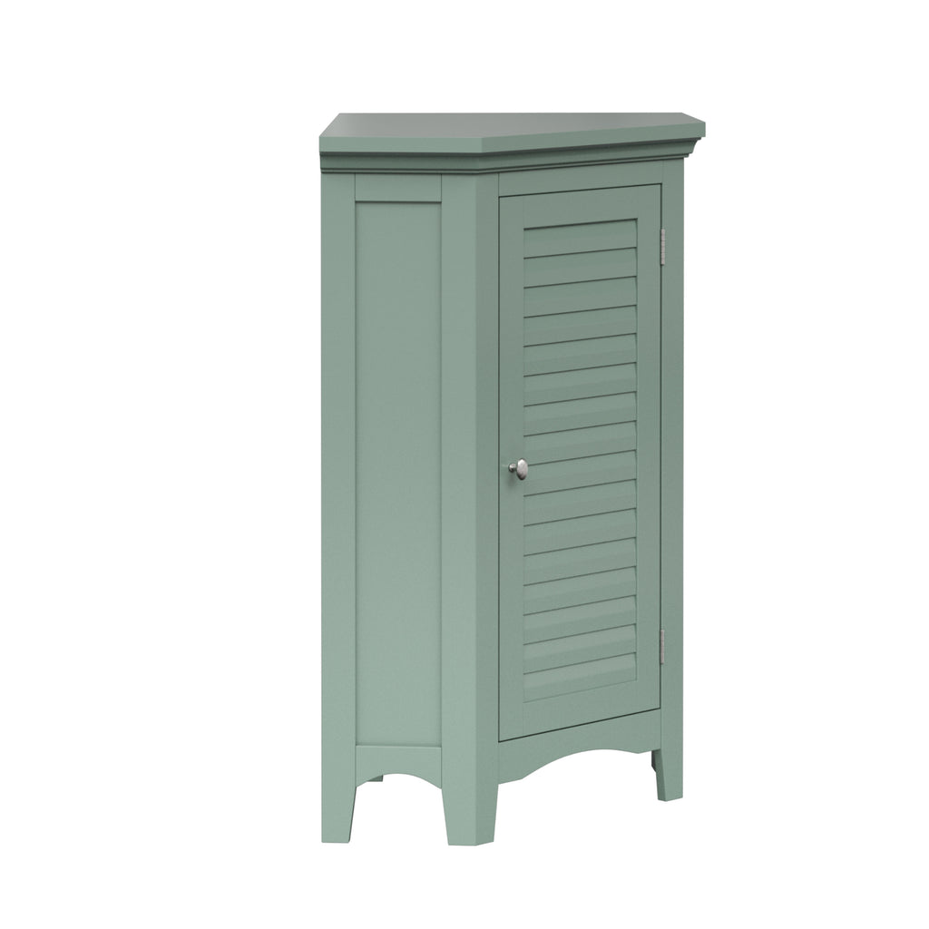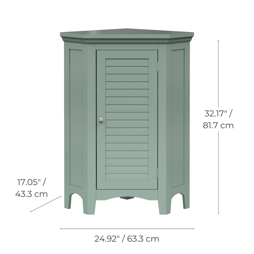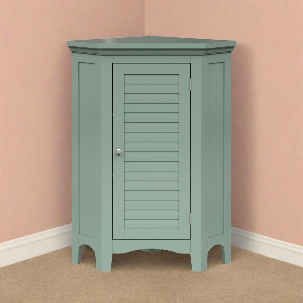 Teamson Home's Glancy Freestanding Corner Floor Cabinet features a Sage Green finish, a crown moulded top and skirting, shaker-style legs, and a faux louvered door.