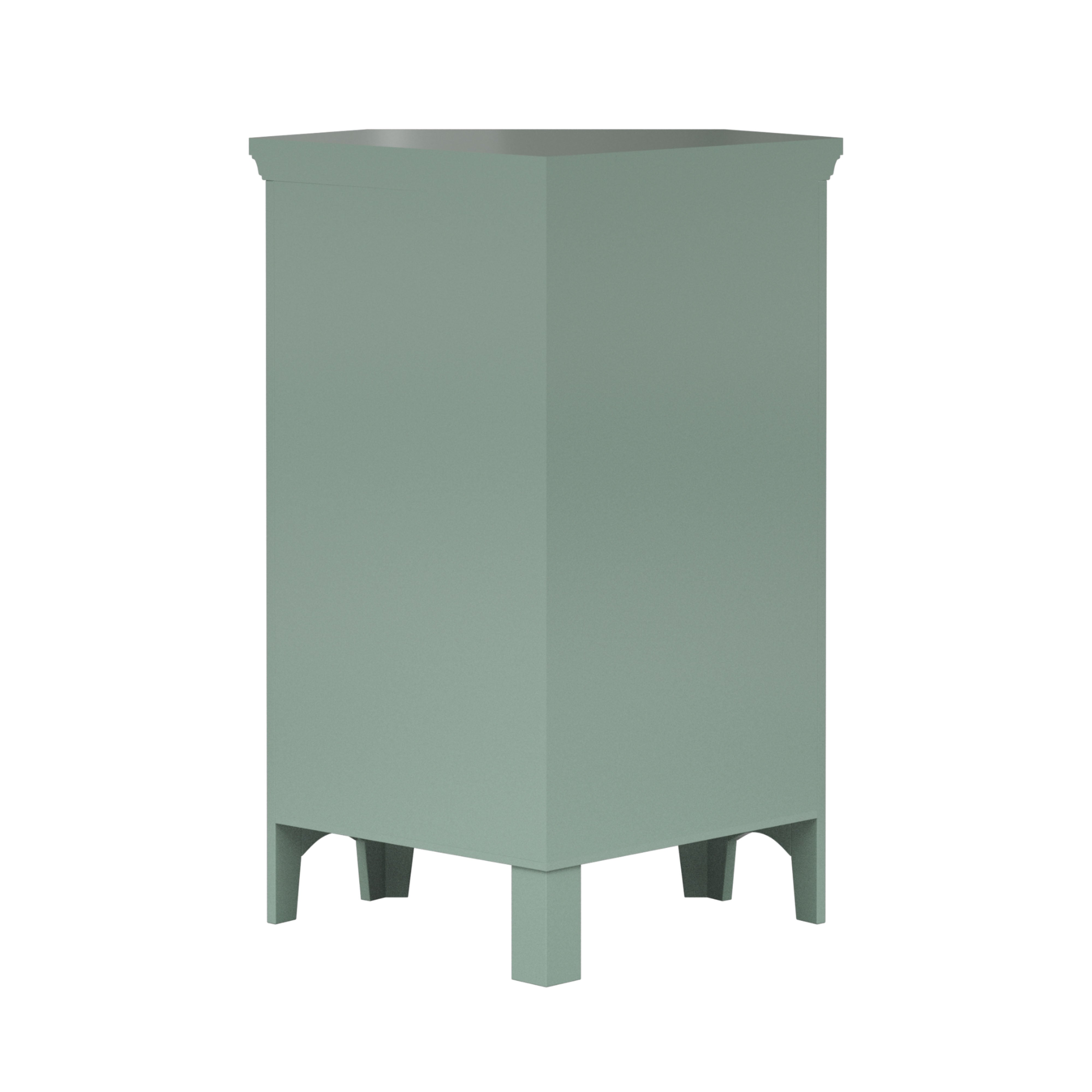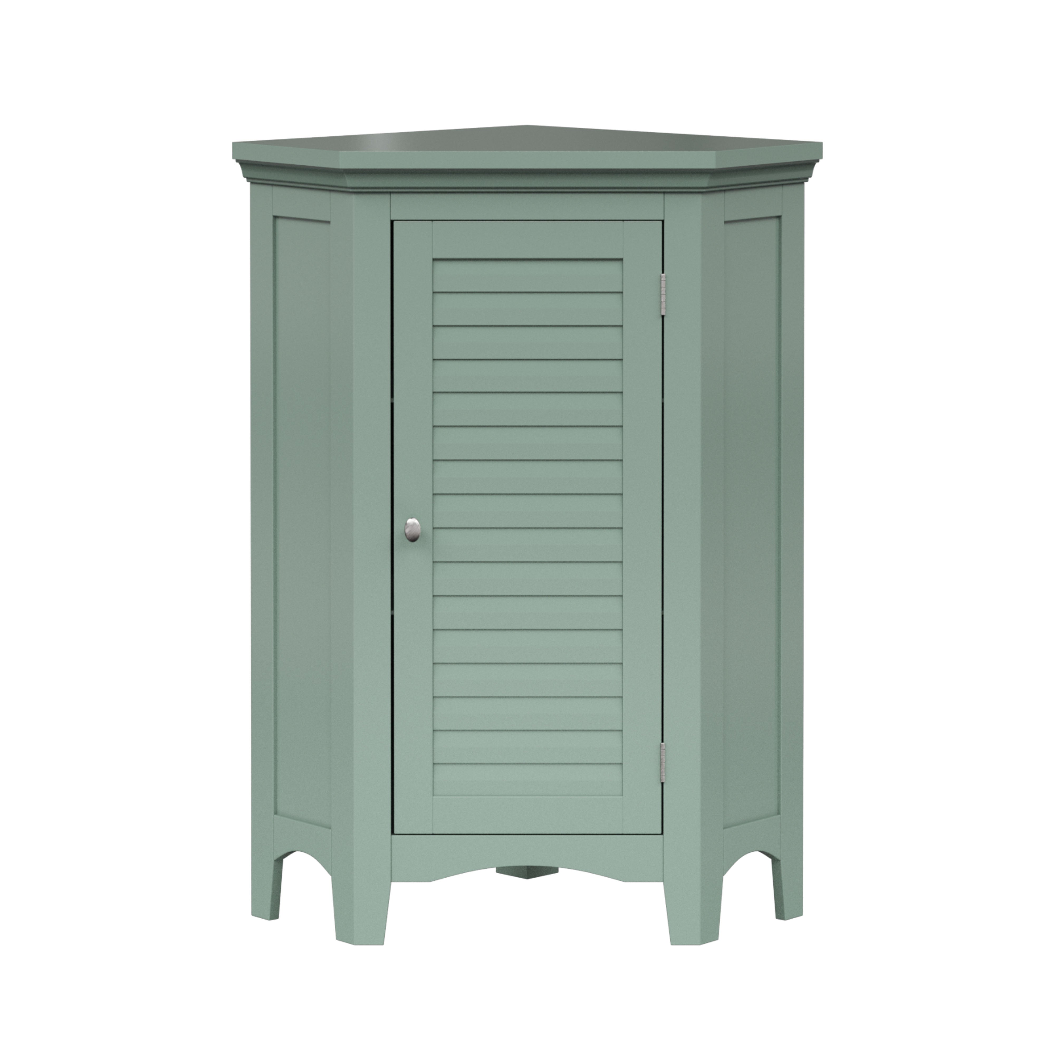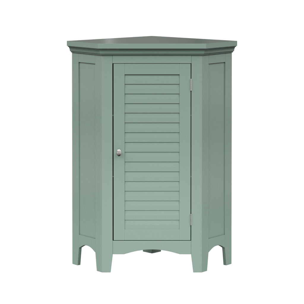 Teamson Home's Glancy Freestanding Corner Floor Cabinet features a Sage Green finish, a crown moulded top and skirting, shaker-style legs, and a faux louvered door.