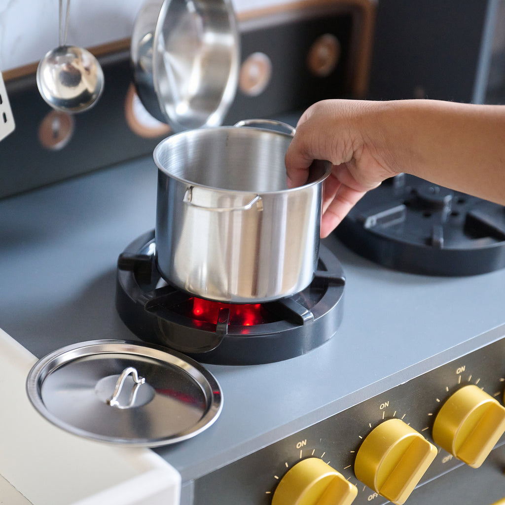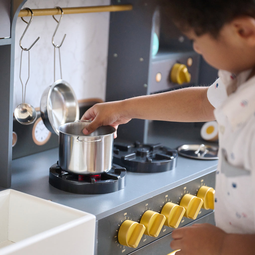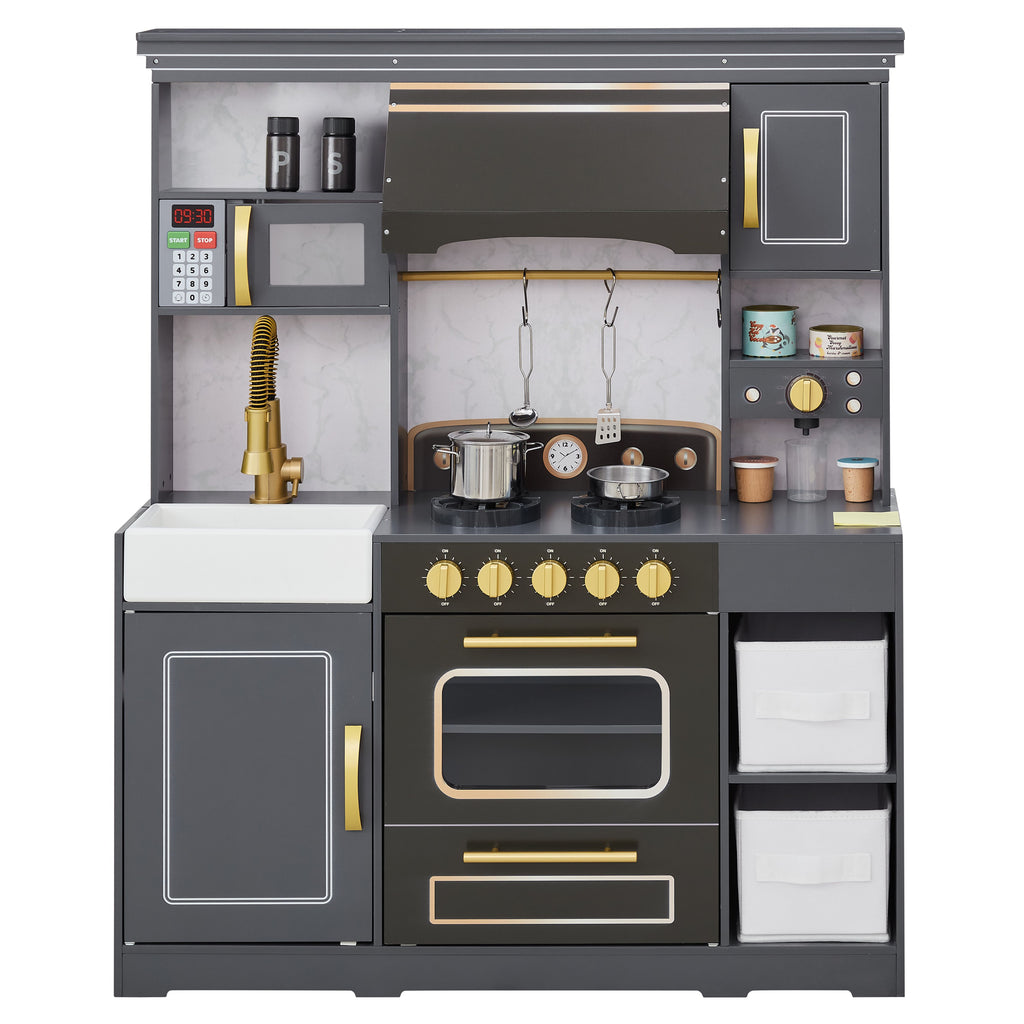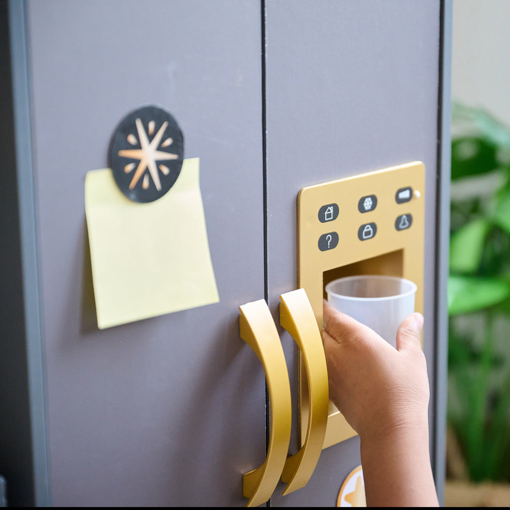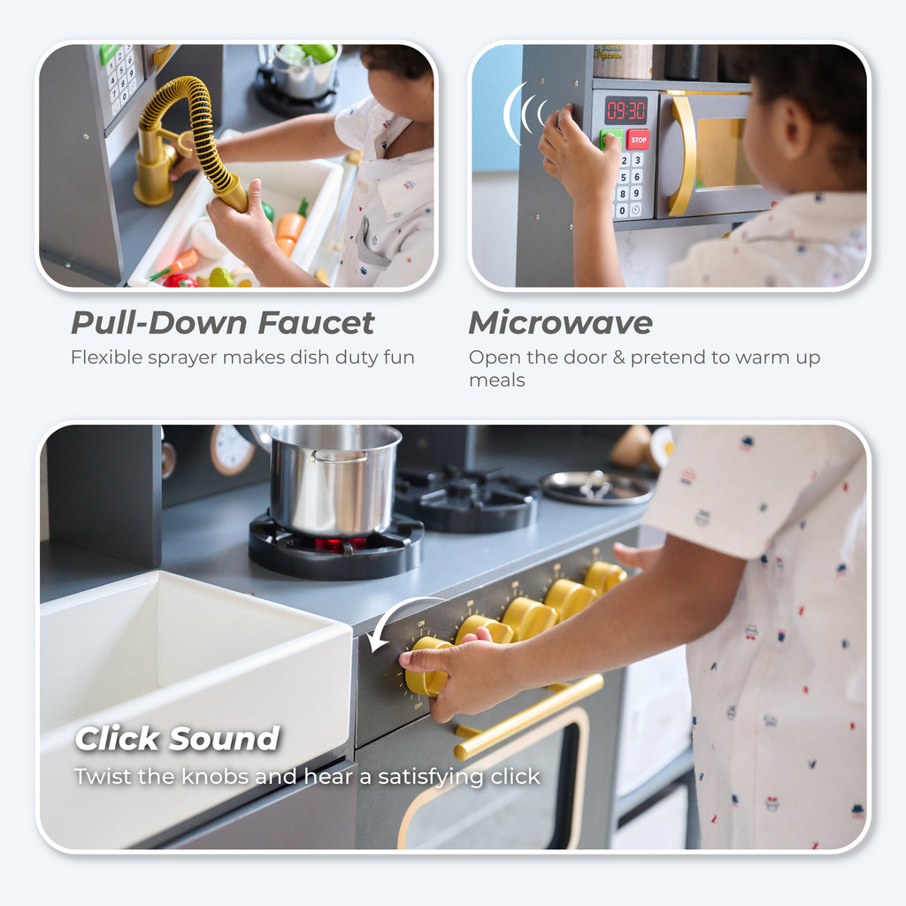 Styled in a modern design with dark grey cabinets, gold-effect handles, and a farmhouse-style sink, this wooden play kitchen fits seamlessly into any stylish home. From the clicking oven knobs to the side-by-side fridge with a magnetic door and pretend ice dispenser, every detail encourages hours of immersive fun.