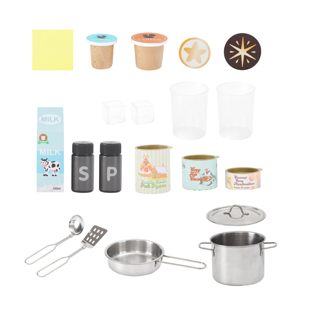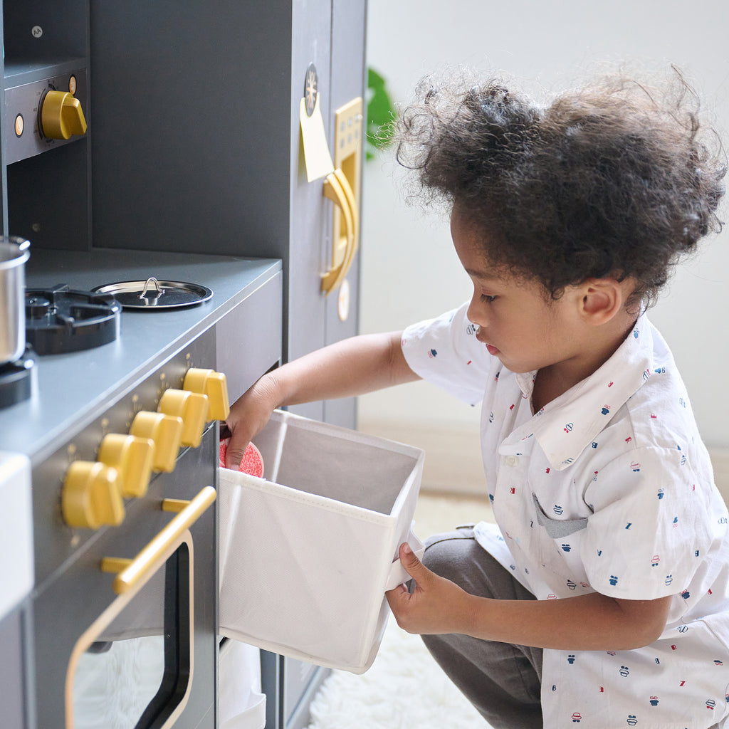Built-in features such as a microwave and coffee maker inspire curiosity, while fabric storage baskets make it easy for children to tidy up and organise their play space. This toy kitchen comes with everything they need to get started, including wooden food items, coffee pods, a milk carton, pots, pans, cups, and more.