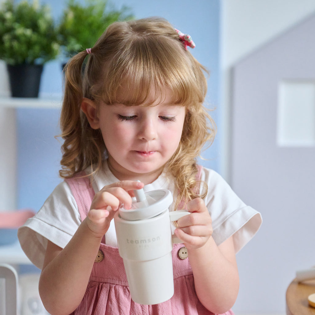 The toaster features a press-down lever, and the coffee machine includes buttons, a removable portafilter and two play coffee beans. The details make it feel real, the butter slices separate and the ingredients can be layered out. Every element invites kids to prep, serve and imagine. This set supports early independence, fine motor coordination, sequencing, and social role play. Whether they're making breakfast for a stuffed animal or packing up for preschool, kids develop confidence through familiar scenarios. With a compact layout and a fresh coconut milk white finish, this set fits beautifully into kitchens, bedrooms or Montessori playrooms. All it takes is a tabletop and a few minutes before the fun begins.