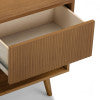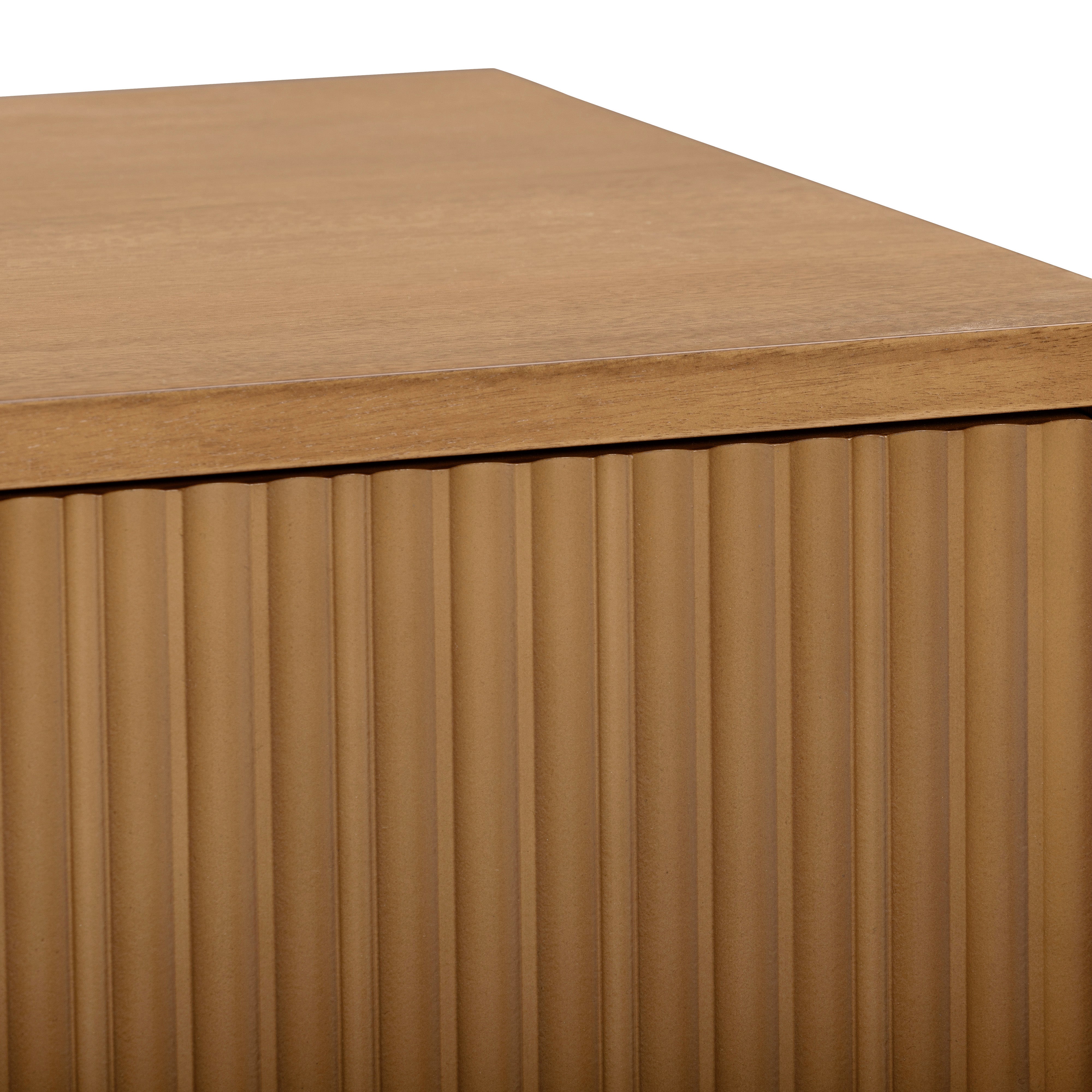 Built from engineered wood panels finished in acacia veneer, with solid wood structural elements for stability, the nightstand is made for regular use. Fluted detailing adds subtle texture, while the natural wood finish brings warmth and versatility to bedroom interiors. The drawer opens smoothly for easy access, and the open shelf keeps frequently used items within reach.